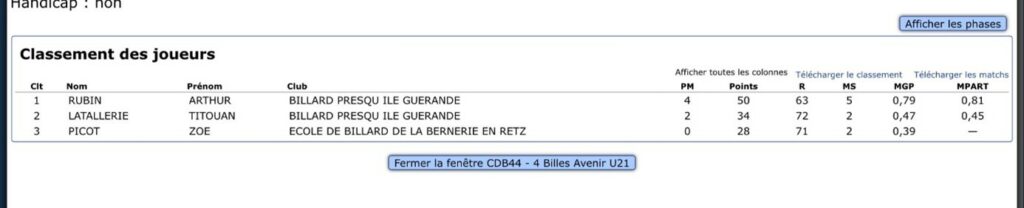 🏆 Ambiance compétitive cet après-midi à Guérande pour les U21 ! Deux épreuves étaient au programme, et Arthur a frappé fort : deux victoires en 4 billes avec une moyenne impressionnante de 0,79 — un exploit d’autant plus remarquable qu’il n’en est qu’à sa troisième séance de billard français !